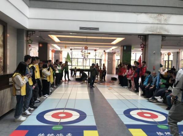 最后一個(gè)項(xiàng)目“旱地冰壺”,以小組為單位,在平滑的地面上進(jìn)行投擲的競(jìng)賽項(xiàng)目。通過(guò)讓自己的壺停放在預(yù)設(shè)好的位置,或?qū)?duì)方球擊出,達(dá)到制勝的目的。這項(xiàng)競(jìng)賽集智慧、戰(zhàn)術(shù)、判斷、技巧、把握時(shí)機(jī)的能力為一體,充分發(fā)揚(yáng)了雙方隊(duì)員誠(chéng)實(shí)信任的體育精神。