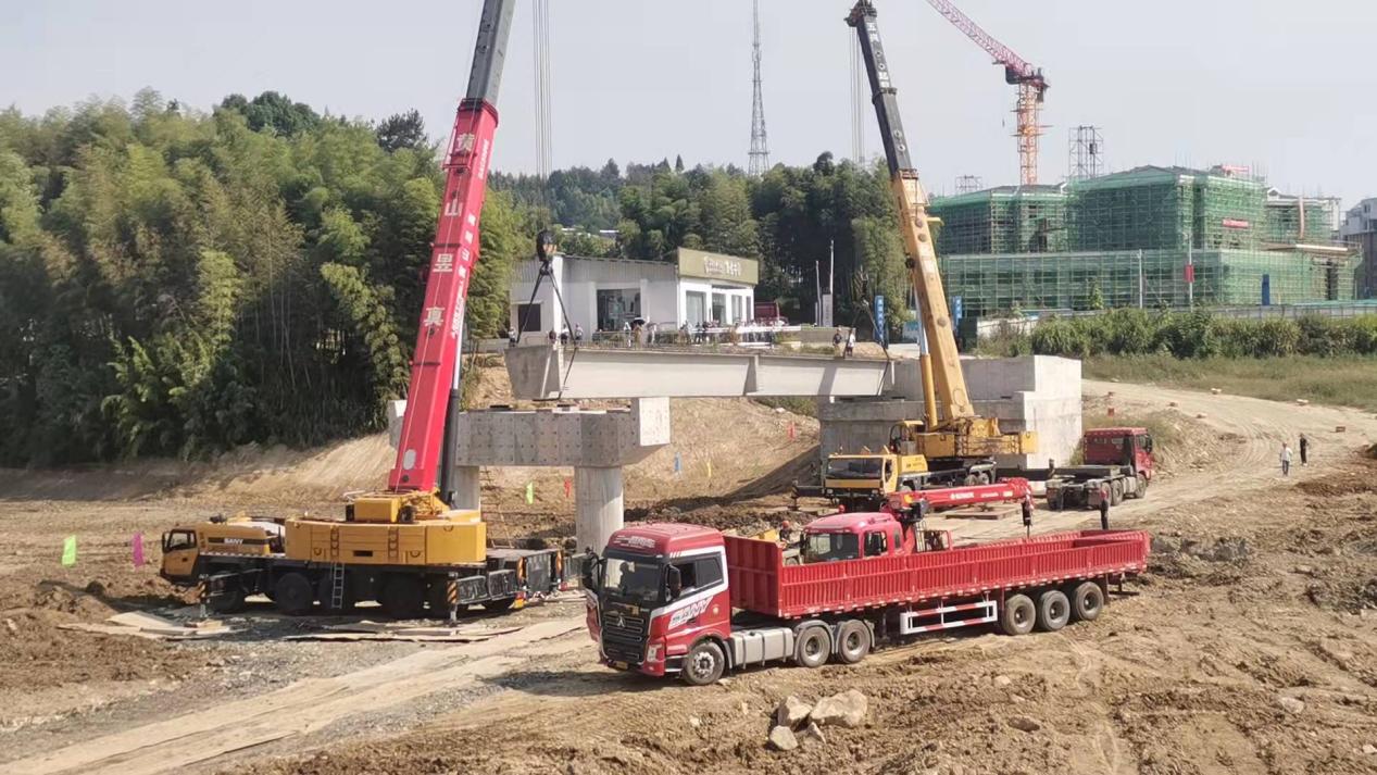 2022年9月27日上午10點(diǎn)20分,鐘山大橋完成了第一片梁板吊裝工作。下午17點(diǎn)左右,鐘山大橋完成了2號(hào)橋墩與3號(hào)橋墩之間的梁板安裝任務(wù)。