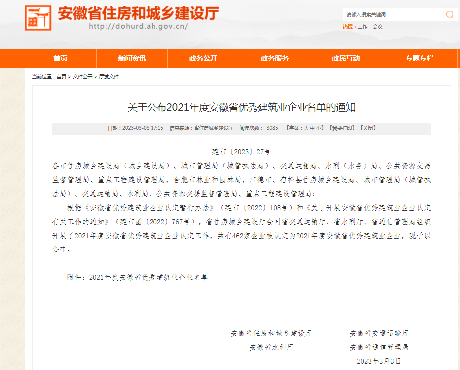據(jù)了解,“安徽省優(yōu)秀建筑業(yè)企業(yè)”是從社會(huì)責(zé)任履行方面、企業(yè)經(jīng)營(yíng)發(fā)展方面、企業(yè)管理創(chuàng)新方面、企業(yè)建造能力方面、企業(yè)文化建設(shè)方面共五部分認(rèn)定建筑企業(yè)綜合實(shí)力。該項(xiàng)認(rèn)定工作的推進(jìn)旨在進(jìn)一步發(fā)揮優(yōu)秀建筑業(yè)企業(yè)引領(lǐng)帶動(dòng)作用,打造“安徽建造”優(yōu)質(zhì)品牌,推動(dòng)我省建筑業(yè)高質(zhì)量發(fā)展。