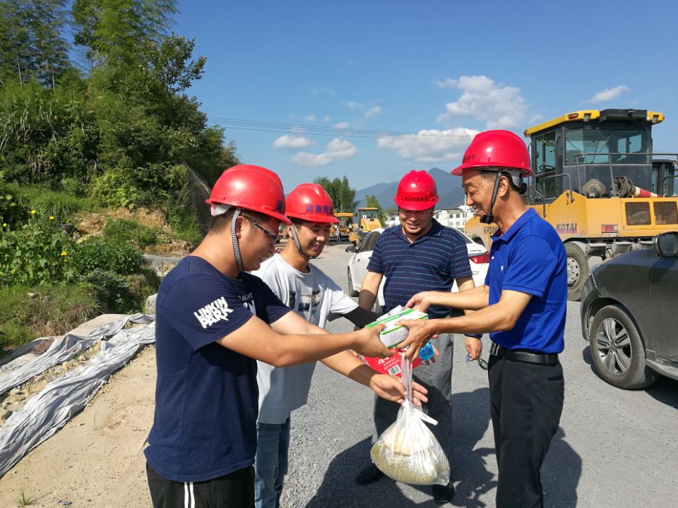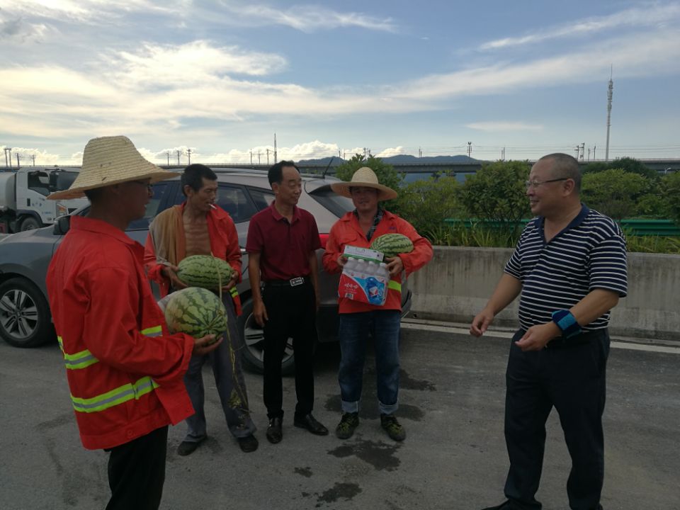 黨支部書記李惠明現(xiàn)場發(fā)放防暑降溫用品,表示慰問