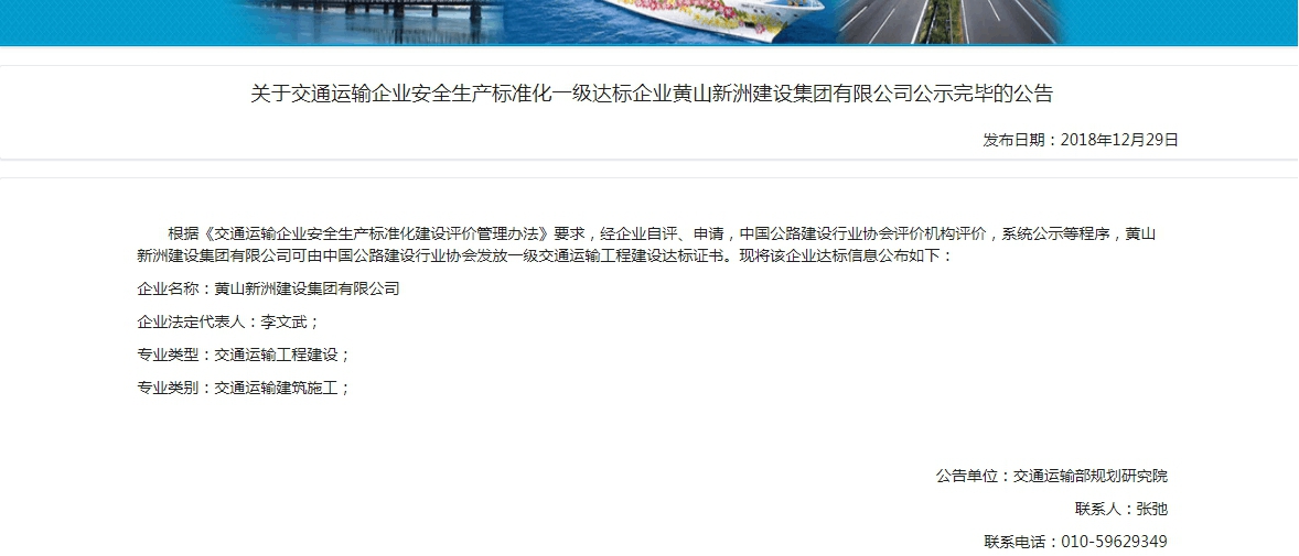 近日從交通運輸企業(yè)安全生產(chǎn)標(biāo)準(zhǔn)化管理系統(tǒng)獲悉,黃山新洲建設(shè)集團有限公司交通運輸部安全生產(chǎn)標(biāo)準(zhǔn)化一級達標(biāo)已公告,標(biāo)志著我集團公司的交通建設(shè)工程安全生產(chǎn)標(biāo)準(zhǔn)化工作上升了一個新的臺階。自2018年1月份開始至今安全生產(chǎn)標(biāo)準(zhǔn)化創(chuàng)標(biāo)工作經(jīng)過一年多的申報、現(xiàn)場考核、考評工作圓滿結(jié)束。